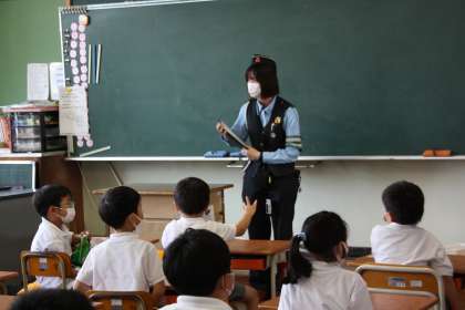 6年生の「交通安全を語る会」が終わったあと、沼津市の交番の警察の方と交通指導員の方から、交通安全についてのお話がありました。真剣にお話を聞きました。