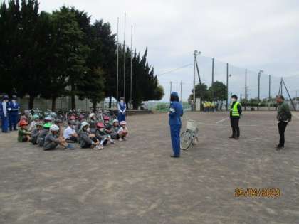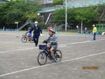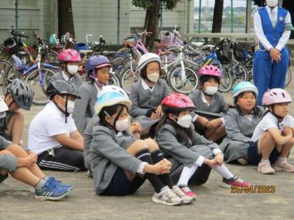 4年生の自転車教室では、運動場で実際に自転車を使って、安全な自転車の乗り方、注意することなどたくさんのことを学びました。また、教室では、安全のルールについて学び、テストも受けました。