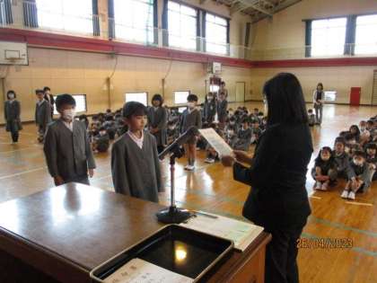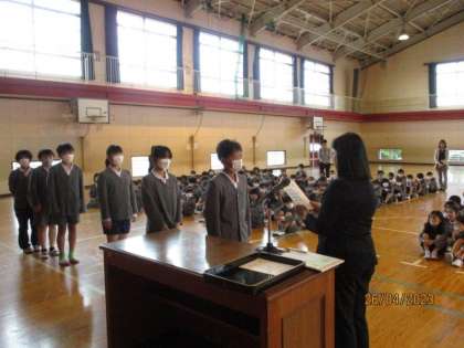 3年生以上の学級委員と委員会委員長の任命でした。全員がいい姿勢、いい目で、任命される代表児童の方を見ていて、大変立派でした。