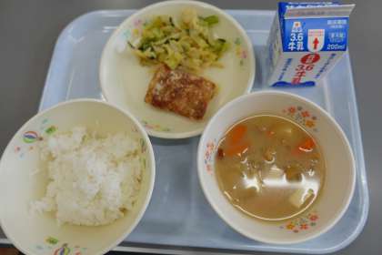 ごはん ぎゅうにゅう たちうおのからあげ ごまあえ とうふのみそしる