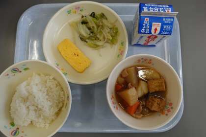 ごはん ぎゅうにゅう あつやきたまご キャベツともやしのいためもの とりにくとなまあげのにもの