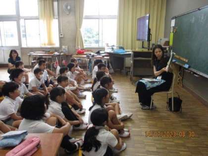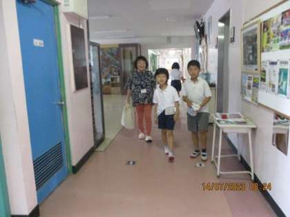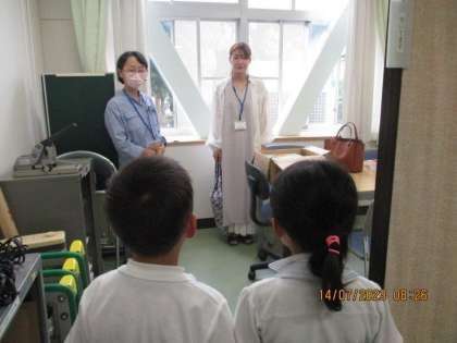 今日は、読み聞かせボランティアの方々が1〜3年生に、本の読み聞かせをしてくださいました。係の子がお迎えにいき、楽しみにしていた読み聞かせが始まります。