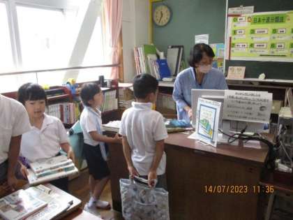 今日は図書館司書の先生が来校する日です。子どもたちは、借りたい本のバーコードを揃えて「借りたいです。」と、しっかり司書の先生に伝えていました。