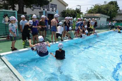 今日は、4・5年生が着衣泳を行いました。泳ぐのではなく、背浮きの練習をしました。
