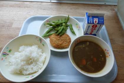 ごはん ぎゅうにゅう ポークカレー まめとかぼちゃのコロッケ ゆでえだまめ