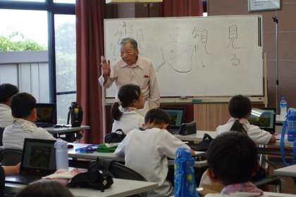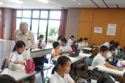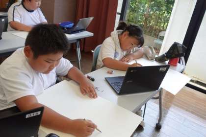 ひまわり畑から地区センターに場所を移動して、涼しい中でひまわりの絵を描きました。