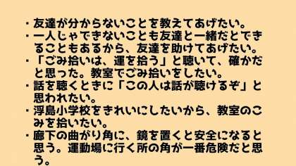 始業式では、6月の朝会で話したことを元に子どもたちが考えてくれたことが素晴らしかったという話とけがをして周りの人に助けられたことで「生きること」について深く考えた方の紹介をしました。真剣に話を聴いてくれました。