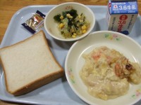 今日のこんだては、キムタクごはん、ぎゅうにゅう、イカのチヂミ、ナムル、茎わかめのスープです。