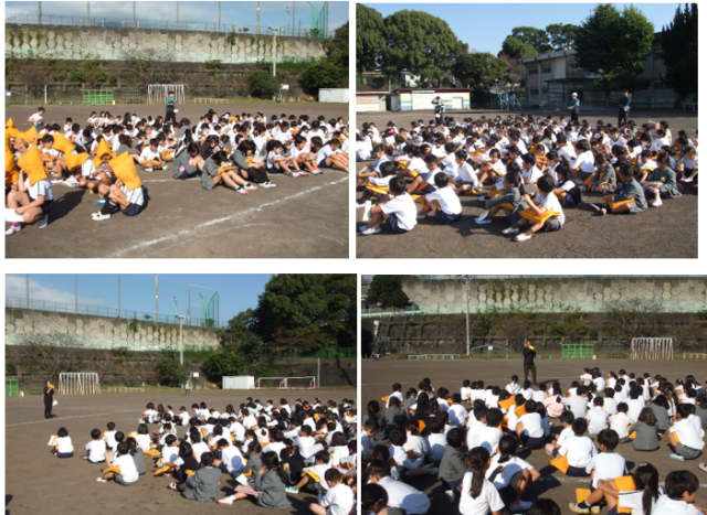 運動場に避難した後、先生方のお話を聞き、消防への通報の仕方や初期消火の方法を教わりました。
