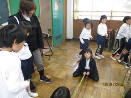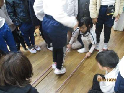1年生は音楽の授業で、「いるかはざんぶらこ」の曲に合わせて、バンブーダンスに挑戦しました。
