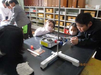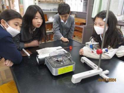 4年生は理科の授業で、熱の伝わり方の実験を行いました。金属の棒にろうを塗り、棒の先に火を近づけ、その様子をしっかり観察しました。