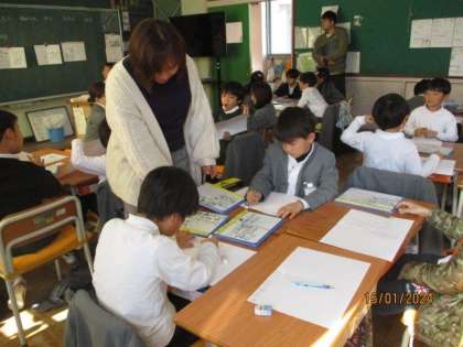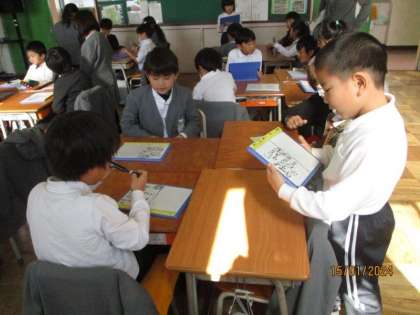 1年生は生活科の授業で、保育園の園児さんたちに「一年生でできるようになったことを教えてあげよう。」という活動をしました。まず、自分のできるようになったことをホワイトボードに書いて、グループで発表しました。次に、本の形にまとめました。