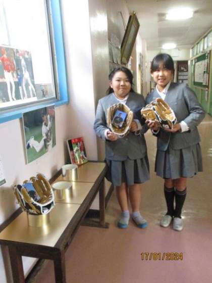 今週3日間は、校長室前で披露し、来週からは学年・学級ごとに使い、その後は個人に貸し出したいと考えています。大谷選手の手紙には、「このグローブをお互いに共有し、野球を楽しんでもらうために寄贈いたします。」と書かれていました。
