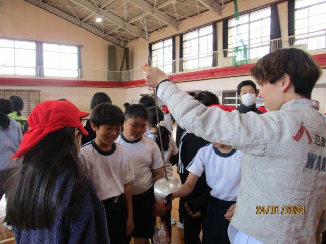 浮島小の体育館で、フェンシング教室が開かれました。オリンピック選手の湧田さんと長良さんが、4年生・5年生にフェンシングの指導をしてくださいました。柔らかくて安全な剣と胴着で戦える「スマートフェンシング」を行いました。NHKの取材も入り、最初は少し緊張気味でしたが、4年生も5年生も楽しく運動することができました。