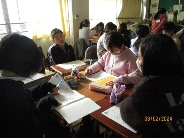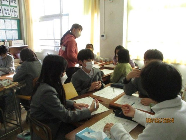 5年生は理科の「電磁石の性質」で、実験で学んだことをグループで協力しながらプリントにまとめていました。実験ではこんな結果だったね、などの振り返る発言が多く聞かれました。