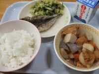 今日のこんだては、ごはん、ぎゅうにゅう、鮭のちゃんちゃん焼き、いもだんご汁です...