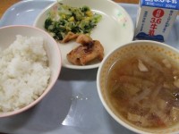 今日のこんだては、ごはん、ぎゅうにゅう、サワラの南部焼き、白菜のおひたし、なま...