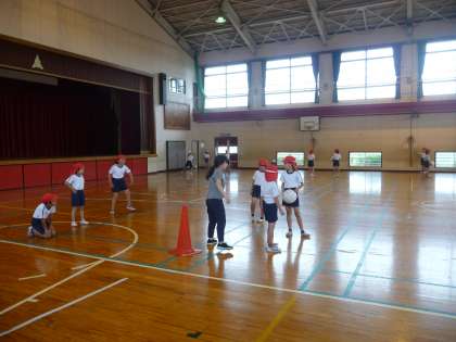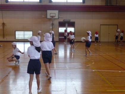 体育の授業です。体育館で、キャッチバレーボールをやっています。まだ、競技になれていないので、ちょっと不安げな子もいます。
