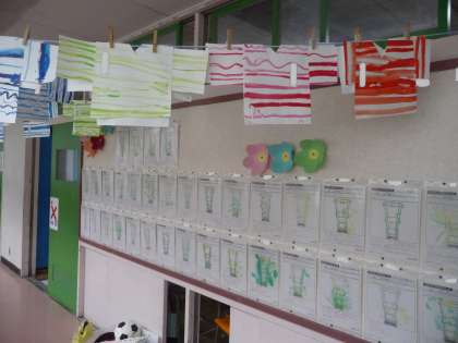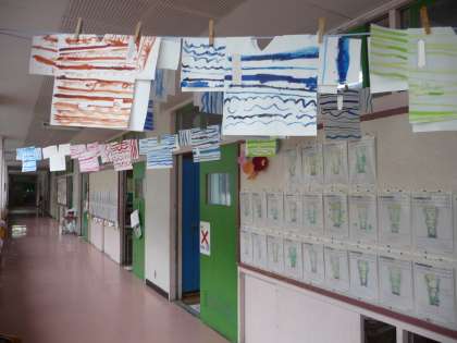 1年生の廊下に、図画工作で制作したかわいらしいTシャツが展示されてありました。絵の具の使い方にも、慣れてきたようです。
