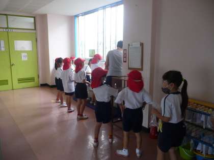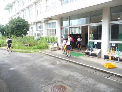 7月最後の登校。雨に降られての登校になるかと気を揉みましたが、何とか止んでいるうちに多くの子が学校に入ることができました。