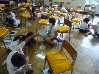英語の授業です。英語で数を言って、カードを取るゲームを楽しんでいます。