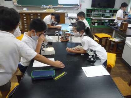 理科の授業です。メダカの卵の観察をしています。