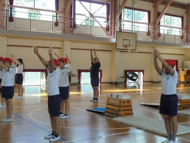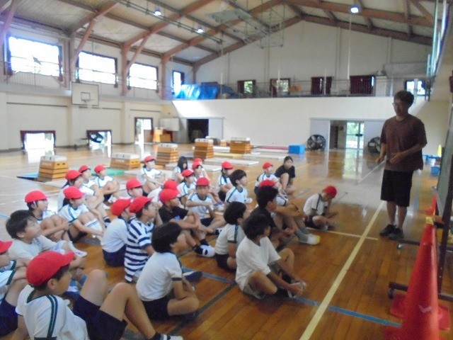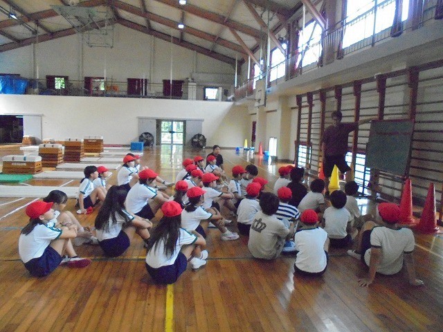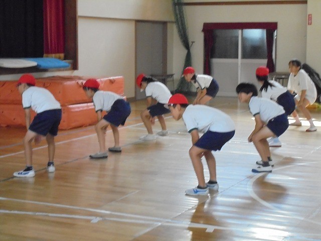 動画の動きに合わせ、全身をしっかり伸ばして準備運動を行った後、これまでの練習でうまくいかなかったことをみんなで話し合いました。「跳ぶときに勇気が出ない」「ジャンプが足りない」「押す力が足りない」など、自分が困っていることが次々と出てきました。その中で、いかに腰を高く上げられるかがポイントだと気付いた子供たちは、今日の練習でどんなことに気をつけたらよいか、めあてをもてた様子でした。