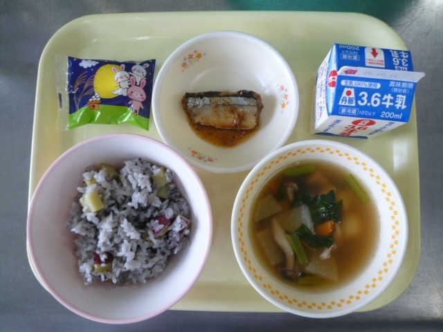 10月3日の給食は十五夜献立で、さつまいもご飯、牛乳、さんまの煮付け、白玉団子汁、お月見デザートでした。