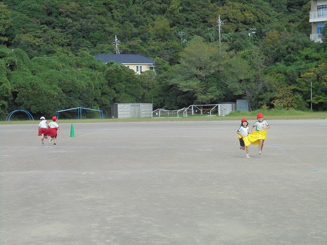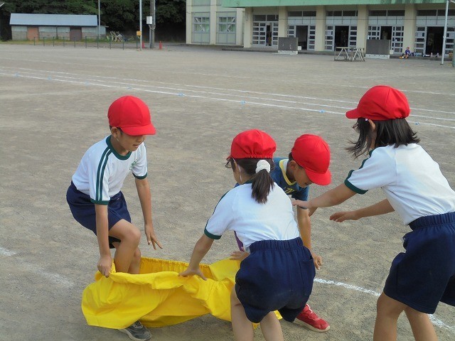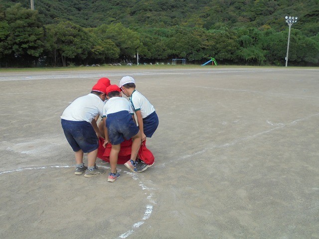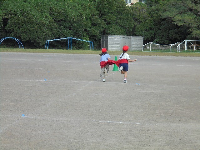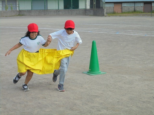 体育の時間に、団体競技の練習をしていました。大きなパンツを2人で履いて行うリレーです。どうやったら早くバトンタッチができるか、やりながらよい方法を探っていました。練習の成果を発揮できるように、どのクラスも、体育の時間だけでなく休み時間にも練習に取り組んでいます。