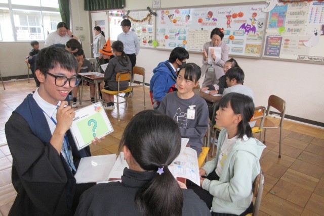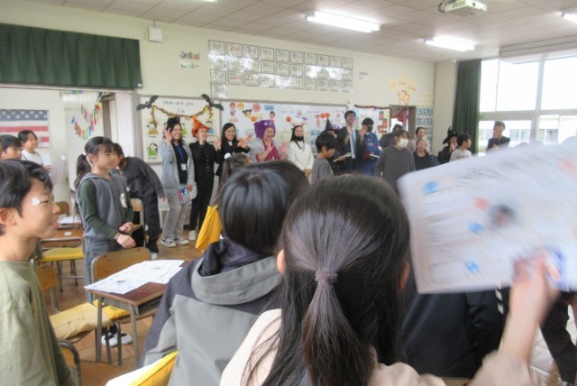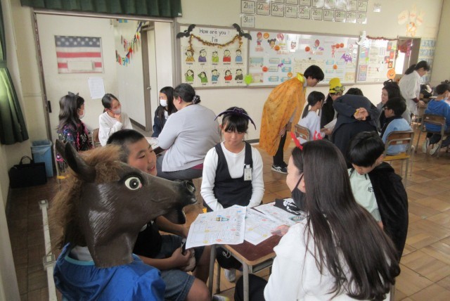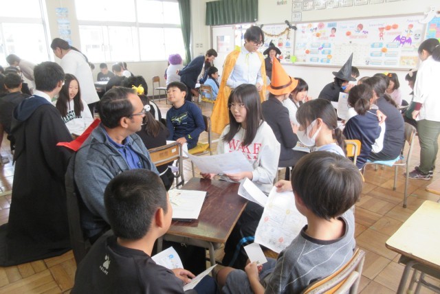 さまざまな仮装をしたALTが児童2~5人につき1人ついてくださって自己紹介ゲームをしました。