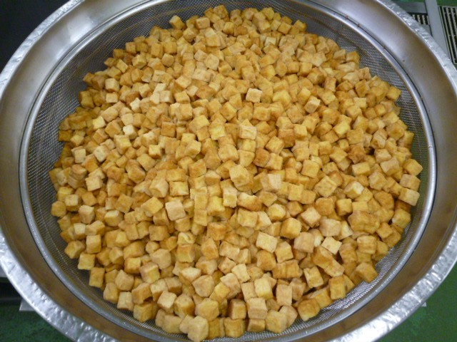 給食では小さめの生揚げを使用して醤油やみそ、砂糖などの調味料で味をつけ、甘辛い味付けになっています。