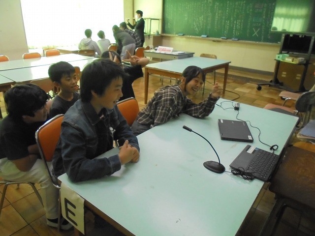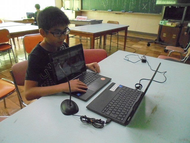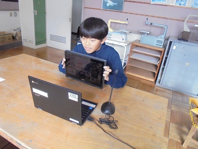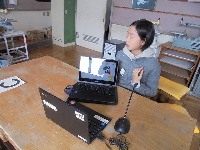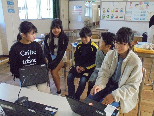 4人グループであいさつをしたり簡単な会話を楽しんだりした後、一人ずつ作成したスライドを見せながら英語で自己紹介をしました。ALTからの質問に対しても、自分なりに英語で答えたり「One more, please.」等と聞き返したりしていました。笑顔やジェスチャーを交えて話す姿がたくさん見られました。