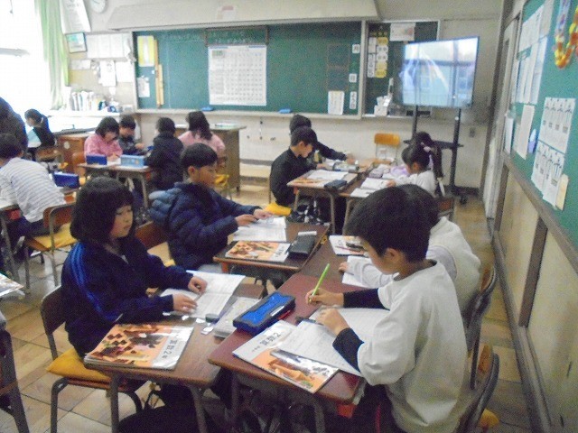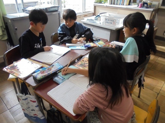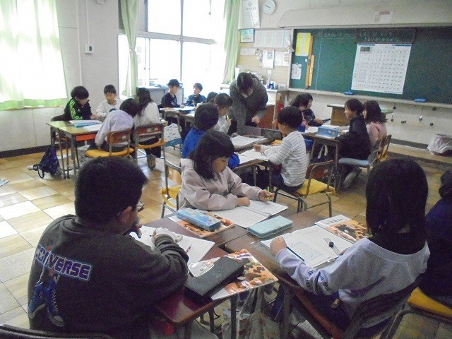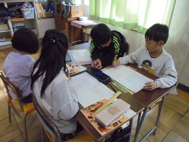 教室をのぞくと、かけ算の表から「かけ算のひみつ」を見つけるために、グループになって話合いをしていました。