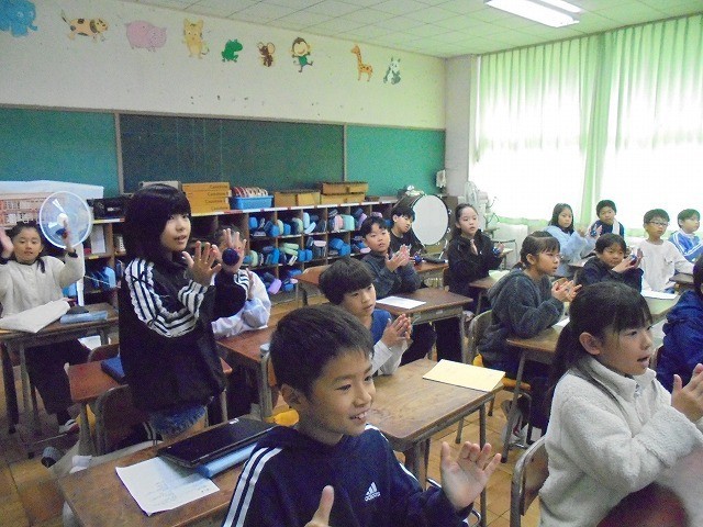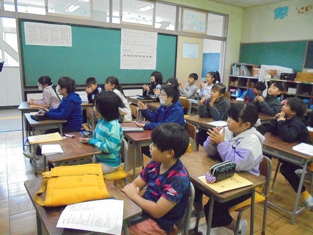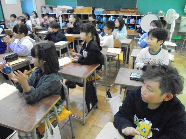 友達がつくった4小節分の3拍子のリズムを、カスタネットや手拍子でリズム打ちをしてみました。「タン(四分音符)」「タ(八分音符)」「ウン(四分音符)」等を並べた楽譜を見ながら、楽しそうに表現していました。「ウン タン タン」のように声に出すとより分かりやすく、みんなでそろって演奏することができました。