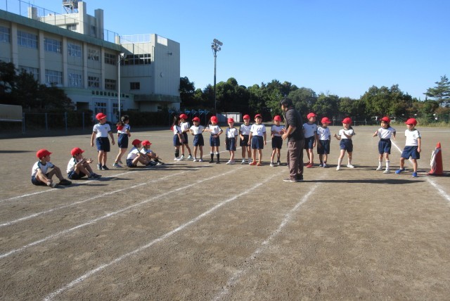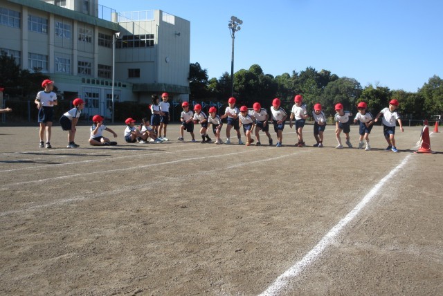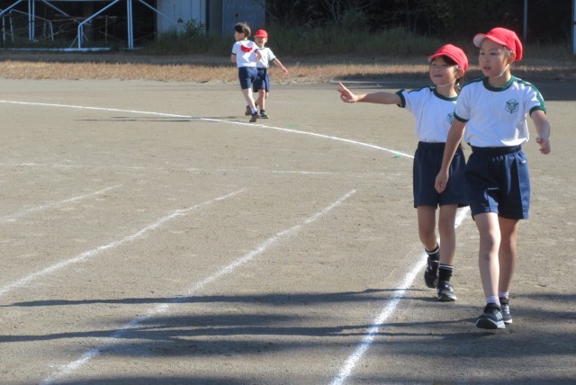 さっき走ったばかりなのに、走る番の子供たちと同じくらいの速さで走っています。