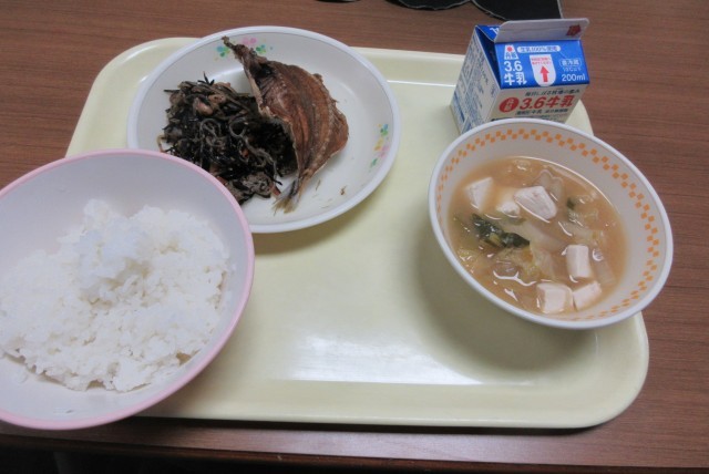 19日は、あじのひもののすあげ、ひじきの炒め煮、大根と豆腐の味噌汁。