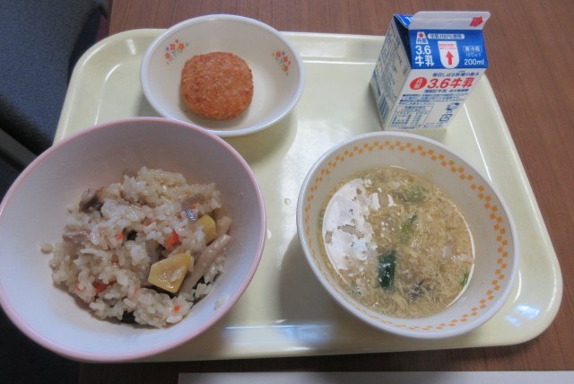 20日は、たきよせご飯、さつまいもコロッケ、かきたま汁。