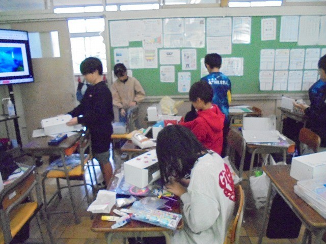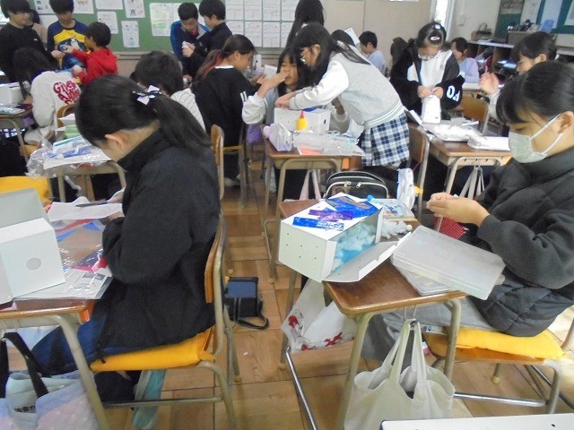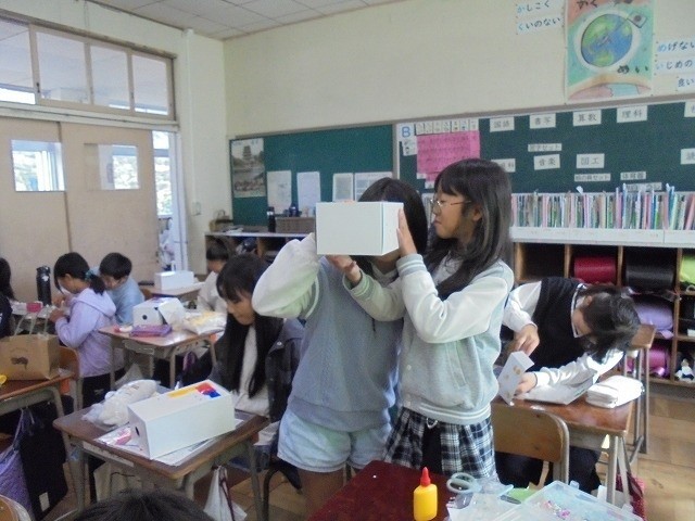白い箱の周りを一部切り取って、箱の中に光が差し込むようになっています。箱の中には、遊園地や水族館など、自分で考えた世界が広がっていました。友達の作品も見せてもらい、感想を伝え合いました。