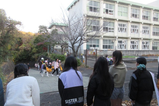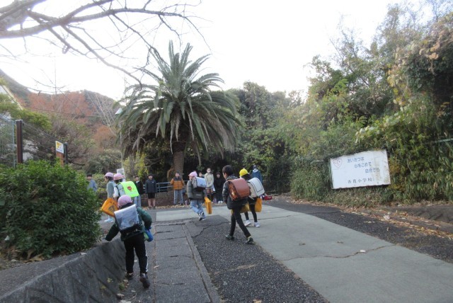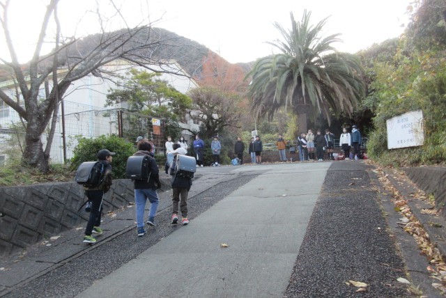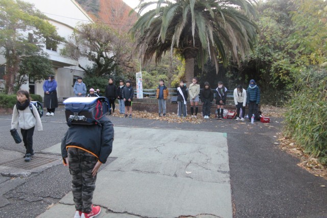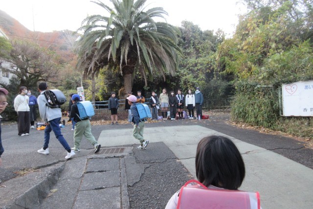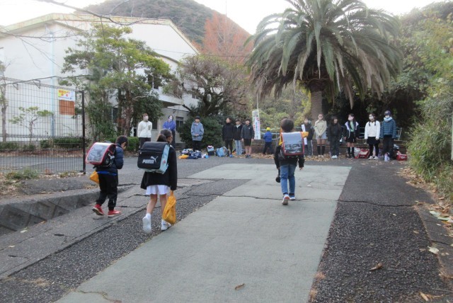 坂道を上がってくる子供たちの中にはあいさつを元気にする子がいます。