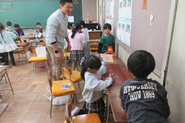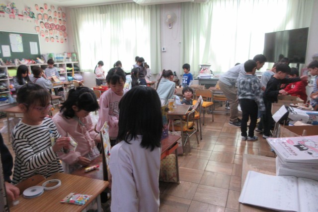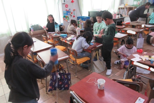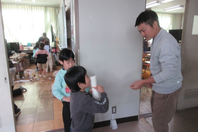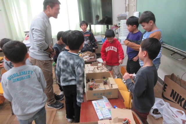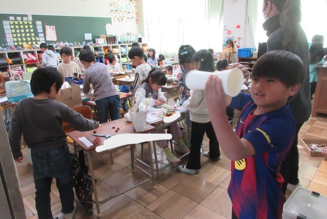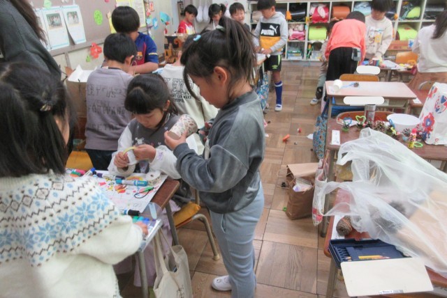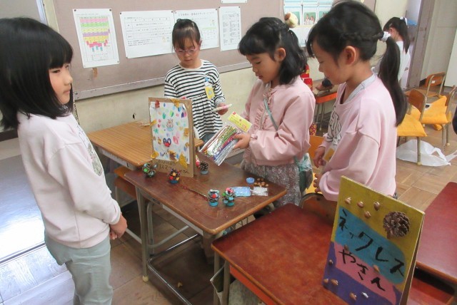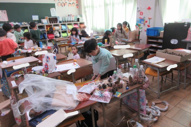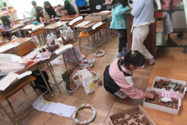 1年生が生活科で秋のものをつかって遊びを考えたり、飾りを作ったり、素敵な物を作っています。