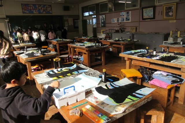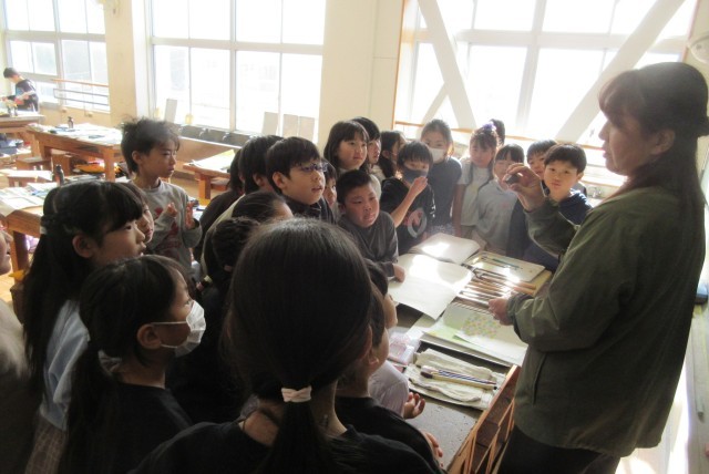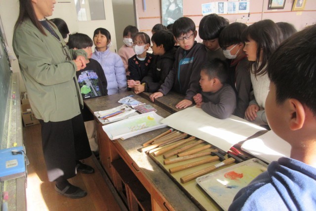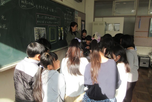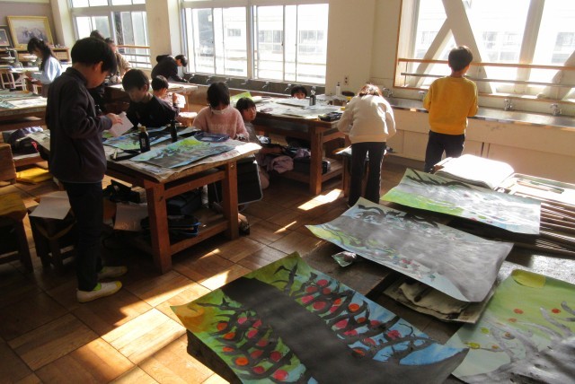 3年生の図工の時間にお話「モチモチの木」の絵を描いています。