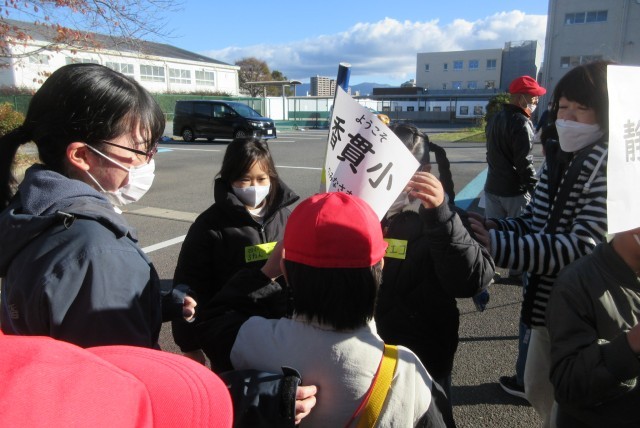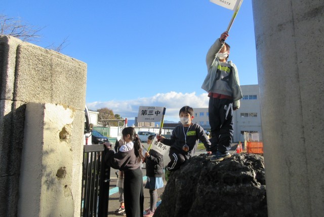 第四小学校の友達が旗を持って歓迎、案内してくれました。