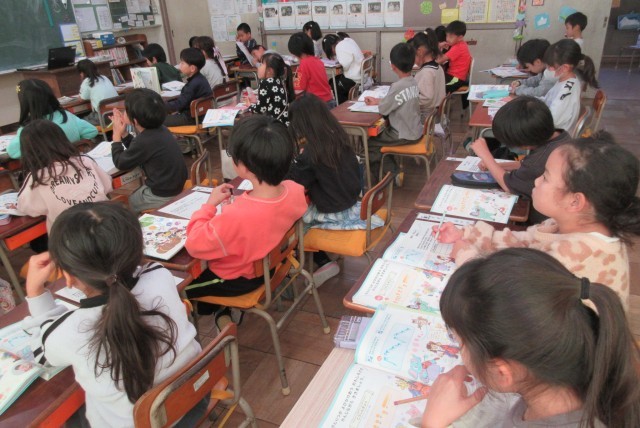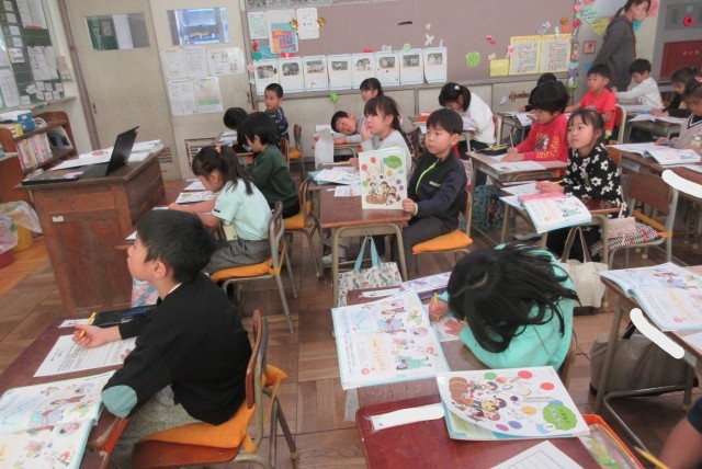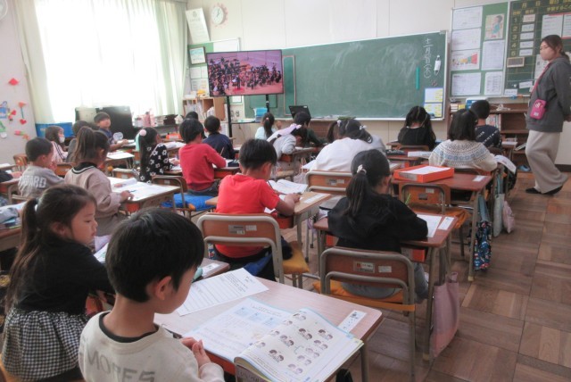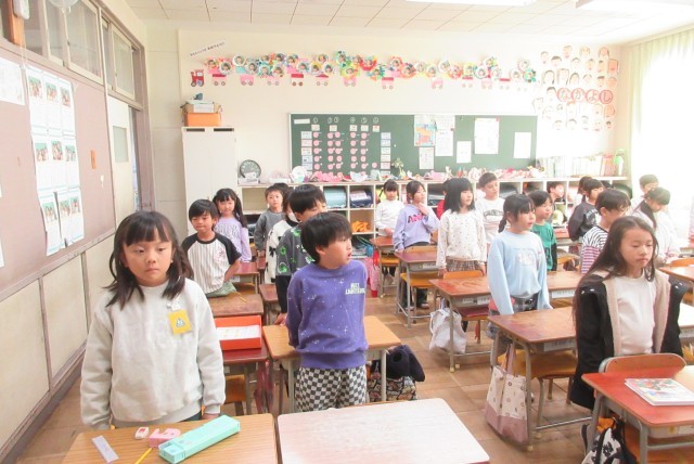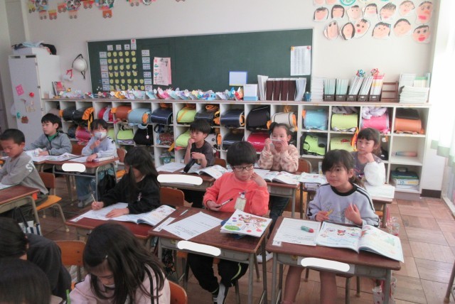 1年生の教室では、大きな声で校歌などを歌っていました。