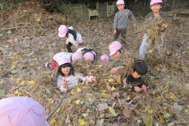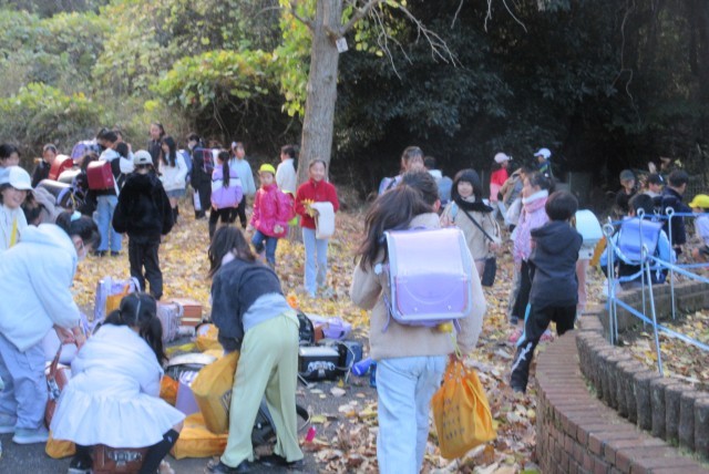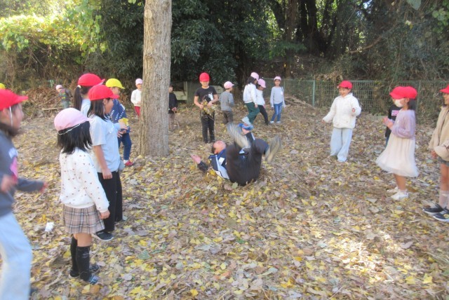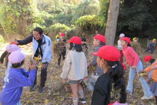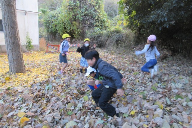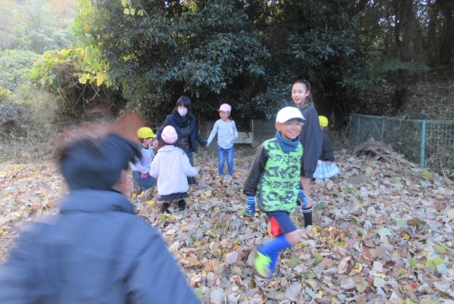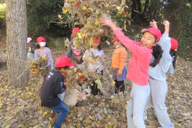 落ち葉がたくさんあるところに足を踏み入れた1年生が「落ち葉がふわふわして気持ちいい」