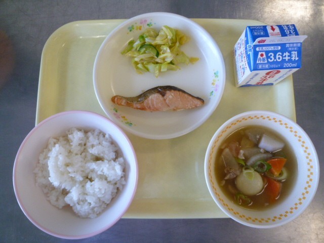 1月23日の給食は、ごはん、牛乳、焼き塩鮭、即席漬け、すいとんです。