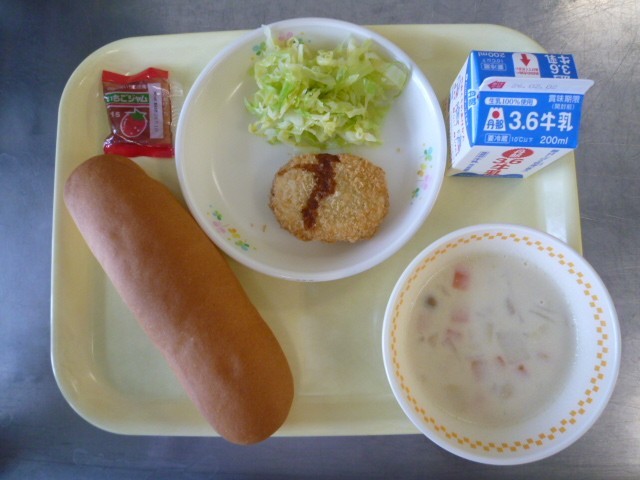 1月26日の給食は、コッペパン、牛乳、野菜コロッケ、ボイルドキャベツ、ミルクスープ、いちごジャムでした。