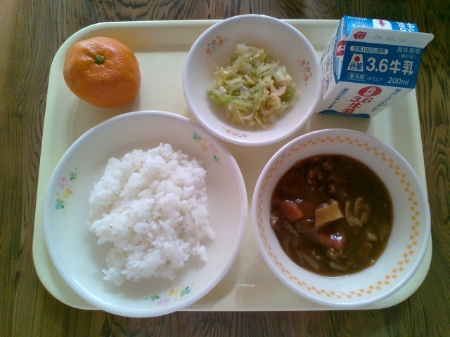 1月27日の給食は、ご飯、牛乳、カレーライス、たくあんあえ、みかんでした。