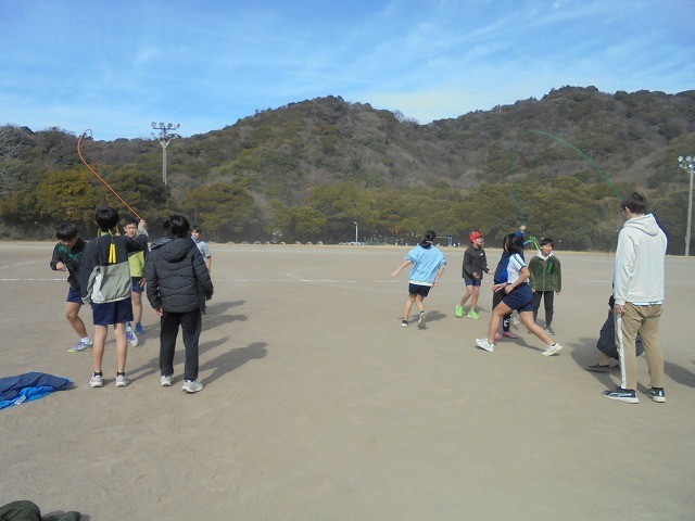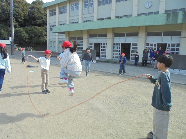 昼休みに、体育委員会が主催した「8の字大会」が行われました。たくさんの子供たちが運動場に集まり、砂埃を巻き上げながら3分間跳び続けました。