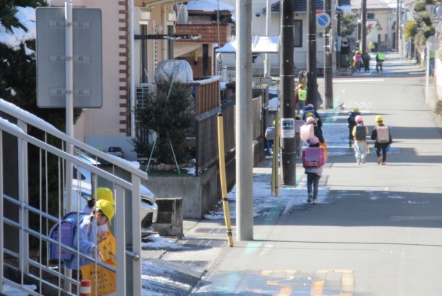 週末の雪で今朝は子供たちは雪景色の中、登校しました。