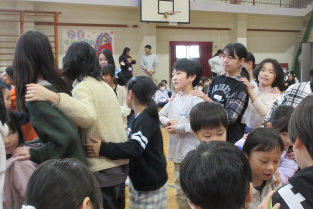 6年生は身をかがめ、目を合わせ、じゃんけんしたり、2年生と列を作ったりするなど、